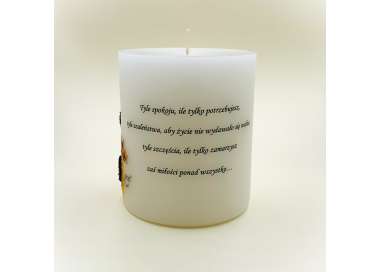 Nasza ręcznie robiona świeca ozdobna łączy w sobie inspirującą sentencję oraz piękno suszonych bratków, gipsówki i kwiatów polnych. To nie tylko...