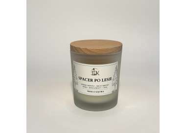 Świeca sojowa w szronowanym szkle z drewnianą pokrywką o pojemności 205 ml, idealna do tworzenia przytulnej atmosfery w każdym wnętrzu.